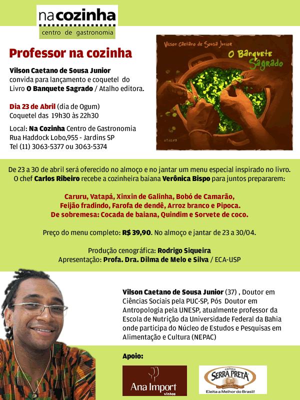 O professor Pós-Doutor em Antropologia, Vilson Caetano de Souza Júnior, lançou seu livro “O Banquete Sagrado” no dia 23 de abril, no Na Cozinha Centro de Gastronomia, em São Paulo. Neste mesmo local, até o dia 30 de abril, o público poderá comprovar no almoço e no jantar, um menu especial inspirado no livro.