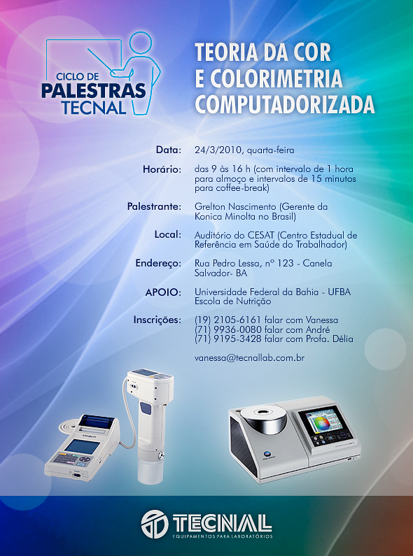 O Ciclo de Palestras Tecnal com o tema: Teoria da cor e calorimetria computadorizada, acontecerá no dia 24/03, no auditório do CESAT (Centro Estadual de Referência em Saúde do Trabalhador), Canela.  Sob a coordenação da professora Doutora Deusdélia Teixeira de Almeidae, o evento conta com o apoio da Escola de Nutrição da UFBA.